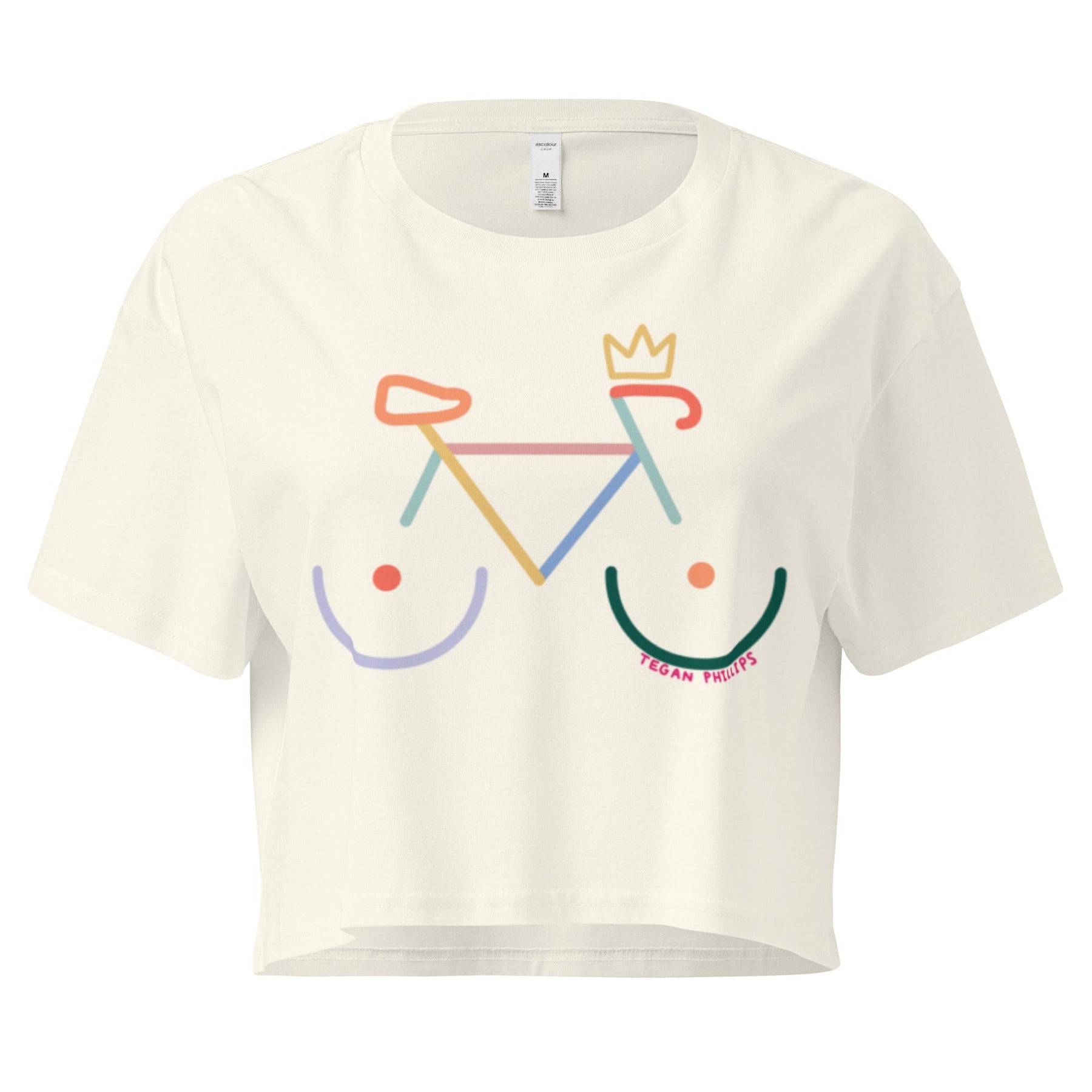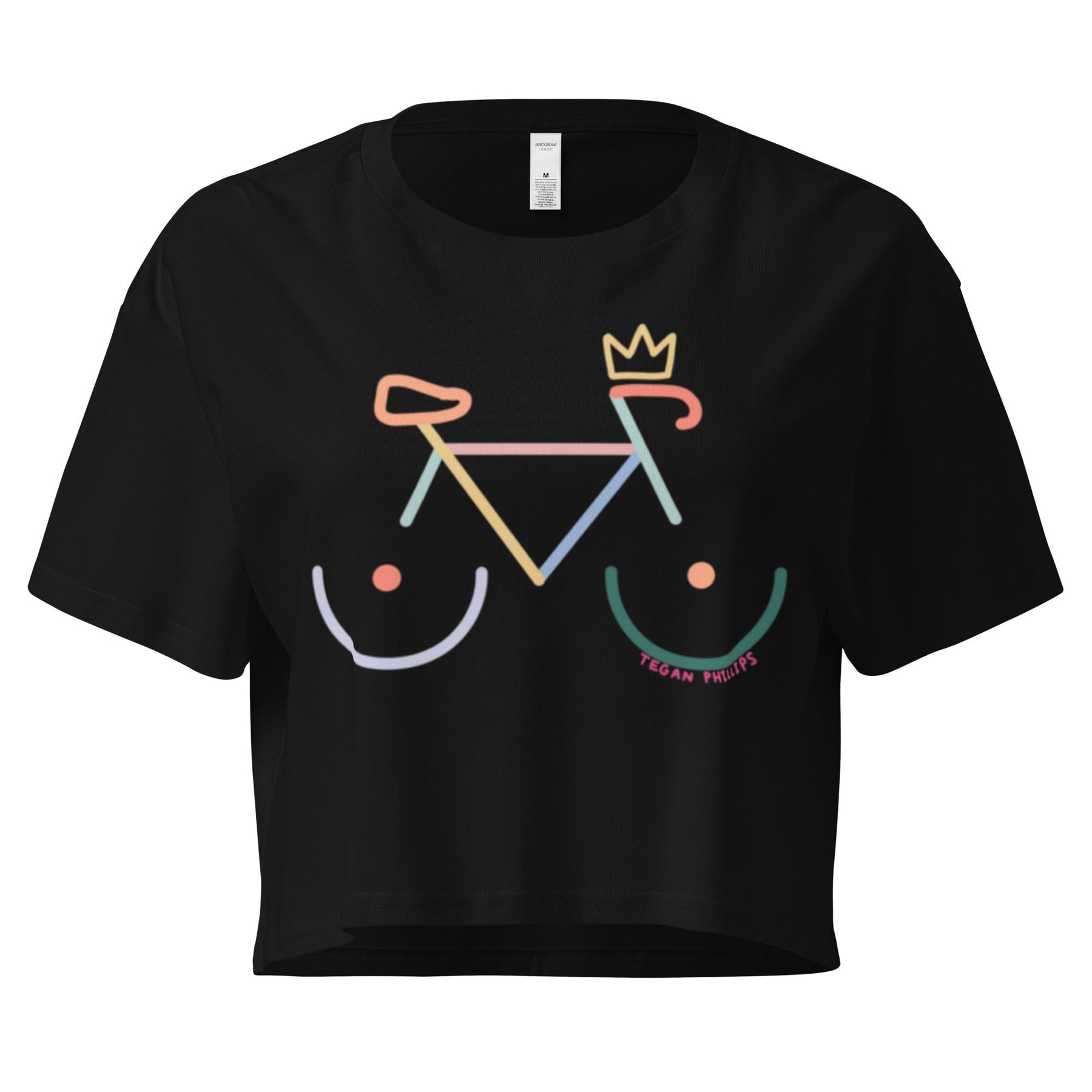 The fit is relaxed and boxy, with a ribbed crew neck, side seams and a cropped length that falls just above the hips. It has dropped shoulders and a straight fit that suits a variety of body types. For the 'Bike Rack' design, if you have a larger chest it's safer to size up for optimal wheel placement, although this makes it a bit less 'crop'.