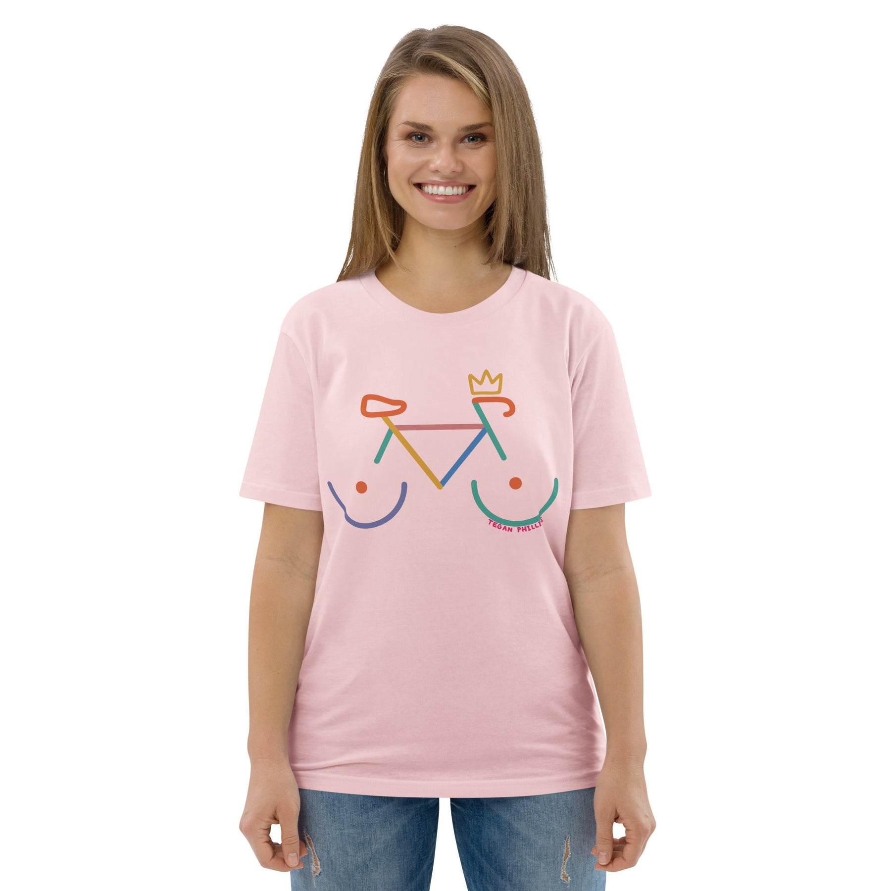 The fit is relaxed and boxy, with a ribbed crew neck, side seams and a cropped length that falls just above the hips. It has dropped shoulders and a straight fit that suits a variety of body types. For the 'Bike Rack' design, if you have a larger chest it's safer to size up for optimal wheel placement, although this makes it a bit less 'crop'.